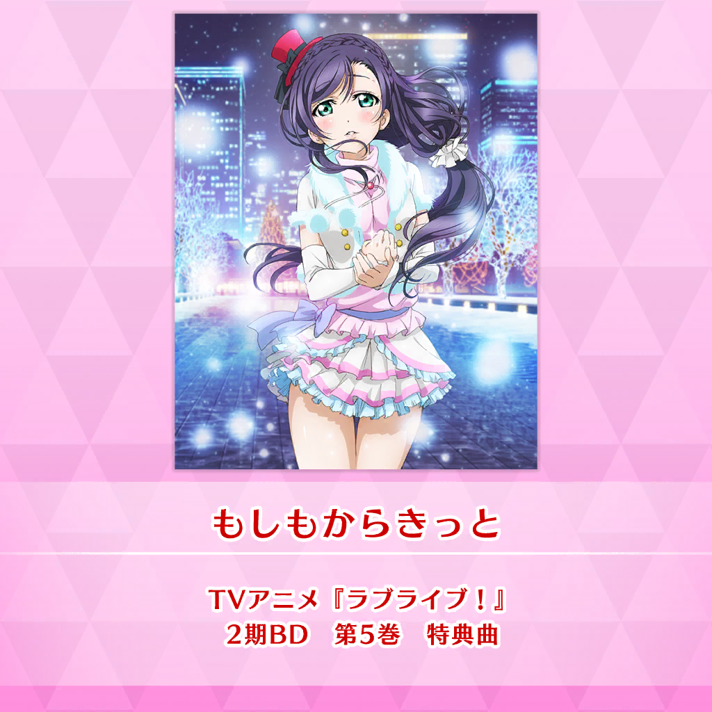| Description | As the one who gave μ's its name and kept a supportive eye on the group from the stage when it was only three girls, Nozomi puts her feelings into song in this slow ballad. It is a gentle tune that gets its message across with a minimalistic sound. |
